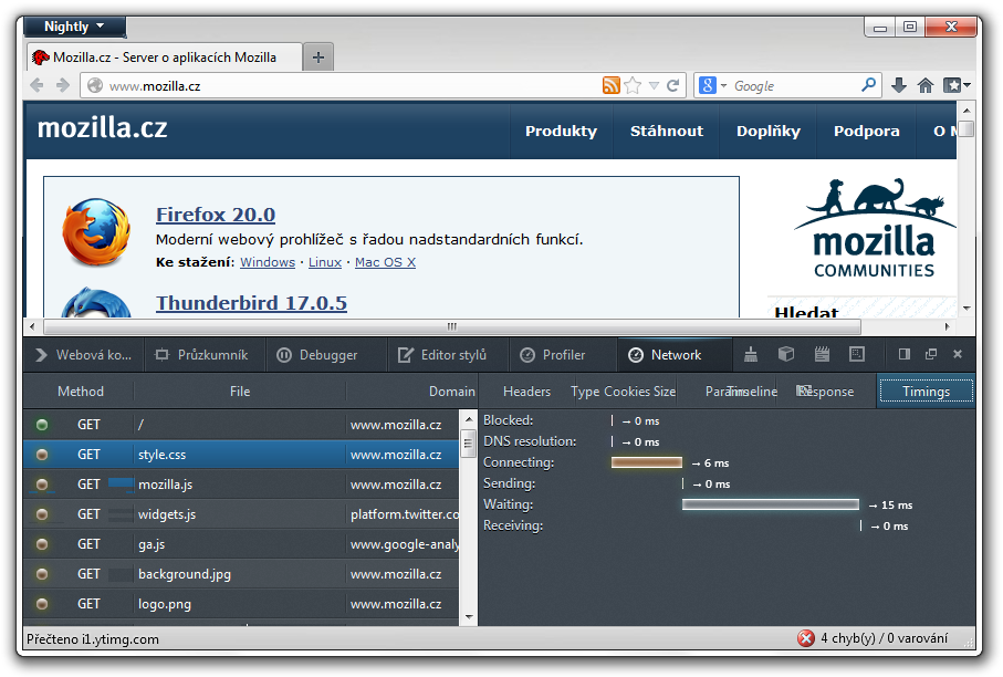 Vývojářské nástroje Firefoxu byly rozšířeny o síťový přehled, v rámci kterého vidíte detailní informace o tom, jak se načítají jednotlivé prvky stránky a jak dlouho jim načítání trvá. Jednotlivé načítané prvky jdou rozkliknout a vývojář tak získá detailní informace o konkrétním požadavku. Novinku naleznete v aktuální vývojové verzi Firefoxu a měla by se stát součástí verze 23.